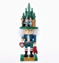 Fly over the rainbow with this 16-inch Wizard of Oz™ Nutcracker. Perfect for your holiday décor and for fans of the Wizard of Oz™, this piece features a nutcracker in green and blue glittered attire with red and white striped socks and a rainbow painted on his shirt. His white hair is covered with a green hat that is depicted as the Land of Oz with the Scarecrow, Tin Man, Dorothy, and the Cowardly Lion in front of it. This will make a wonderful addition to anyone’s nutcracker collection